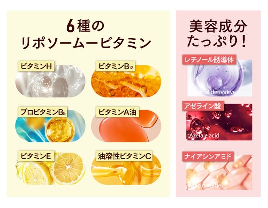 さらに、やさしく角質をやわらかくする皮脂分解酵素を採用。加えて、乾燥しやすい洗い上がりの肌に潤いを与えるため、高還元水をベースに使用し、グルタチオン、レチノール誘導体、リポソーム化した6種のビタミンなど今話題の美容成分を配合しています。