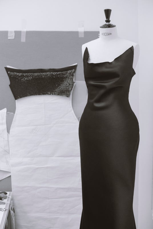 ミア・ゴスはネックラインに刺繍が施されたブラックサテンドレスと、ディオール ファイン ジュエリーを着用しました。