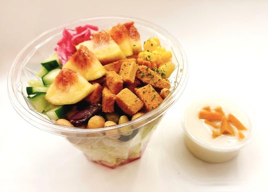 キャベツやイチジク、国産鶏肉を国産きなこで香ばしく焼き上げた『きなこチキン』にゆで卵や豆類などを彩りよく。ドレッシングをかけて蓋をして振れば完成。手作りドレッシングには地元の柿を入れ、軽やかで季節感がある、飽きのこないコールスローを目指しました。