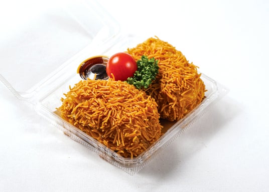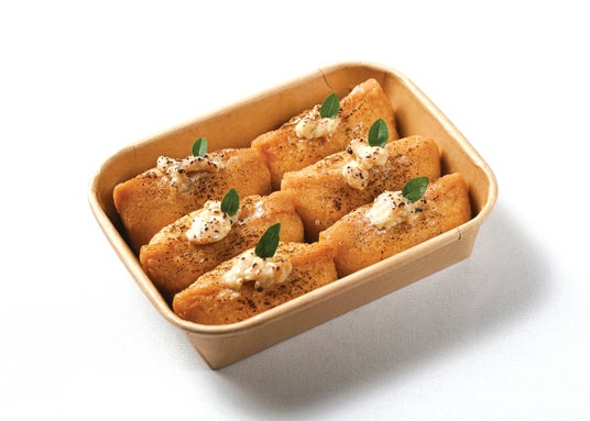 長崎名物皿うどんの新感覚コロッケ。衣には皿うどんを使用し、具材の国産バレイショ、長崎県五島福江島のねりもの、椎茸、イカ、エビや野菜は、オイスターソースなどで作るあんで味を整えました。長崎の皿うどん定番の味変『金蝶ソース』も別添え。