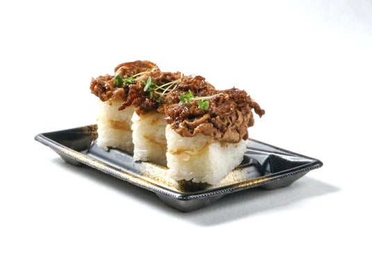 長崎県五島福江島の地元農家が育てた新生姜を食べてほしいと考案。炒めて甘辛く煮た生姜に、ブランド牛『五島牛』は生姜に合わせた味付け。自家製の甘酢生姜をシャリの間に挟みました。牛肉の旨みと新生姜の爽やかな味ですっきりとした味わいです。