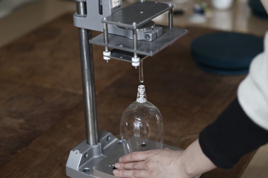 リペアグラスの製造においては、従来の九谷和グラスの製造よりもはるかに難しく高いレベルの技術が求められます。グラスのボウル部分とステム部分を、九谷焼で制作したオリジナルのジョイントパーツを用いて独自技術で接合し、九谷和グラス同様、母材破壊レベルにまで強度を高めた接合技術(2006年度グッドデザイン賞 新領域デザイン部門受賞)を応用しています。これにより、ステムの強度が高まり、折れにくいグラスが生まれます。