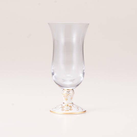 石川県が誇る伝統的工芸品・九谷焼と、江戸硝子をはじめとする国内生産の手づくりの吹き硝 子を融合させてできた「和洋空間の自然調和」をコンセプトとして作り出されたグラスです。接合部の強度が母材破壊レベルに達していることが高く評価され、平成18(2006)年度グッドデザイン賞(新領域デザイン部門)を受賞いたしました。九谷焼磁器で出来た台座(脚)部分は、素地成形、絵付加工ともに手づくりにこだわり、ガラスもすべて国内生産の手づくりされた吹き硝子を使用しております。