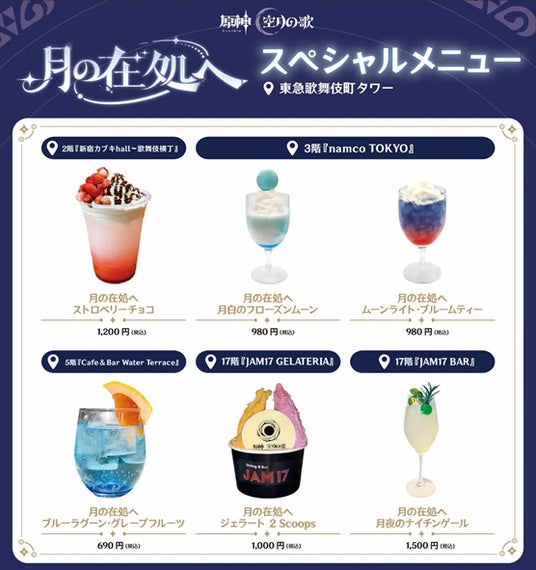本イベントの開催を記念し、本施設内5階にてスペシャル展示を実施します。また、あわせて描きおろしイラストを使用した限定グッズの販売、オリジナルコースター付きのイベント限定フードやドリンクの提供、オリジナルレンチキュラーカードがもらえるスタンプラリー、『原神』「コロンビーナ」をモチーフにした特別カラーにライトアップ、『原神』デザイン装飾や「LunaIV」映像の放映を行うなど、さまざまな施策を実施し、旅人のみなさまをお迎えいたします。