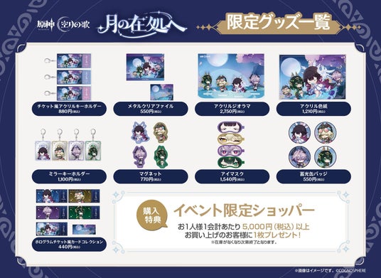 本イベントの開催を記念した限定グッズを販売します。また、特設会場には、本イベント限定のオリジナル装飾を施しております。『原神』の世界観をお楽しみいただけますので、ぜひお立ち寄りください。
