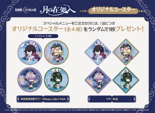スペシャルメニューには、1商品につき1枚、「オリジナルコースター(紙製)」(全4種ランダム)が付きます。東急歌舞伎町タワーの店舗では、「原石50個」の他、ゲーム内アイテムと交換できるシリアルコードがコースターに記載してあります。
