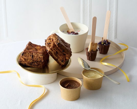 (左)スイート・ハニー・ベイキング・ギフト(チョコレートパイスコーン4個、ハニーバター1個、チョコスプレッド1個)3,780円【限定30・阪急うめだ本店限定】(右)ビー・スプーン・ショコラ(1個入り)611円