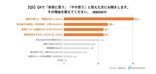 NISAを利用して良かったと思う人の理由は、「資産が増えた・利益が出ているから」が最多の61.3%、次いで「配当金や分配金(不労所得)が得られるから」が38.7%、「投資について勉強することができたから」「資産形成をするきっかけになったから」が34.7%と続く結果になりました。