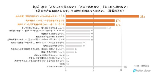 NISAを利用して良かったと思わない・どちらとも言えないと感じる理由は「他の投資(課税口座など)の方が利益が出ていたから」が最多の26.5%となり、「元本割れしている/する可能性があるから」「期待していたほど利益が増えないと感じているから」はそれぞれ17.6%となりました。