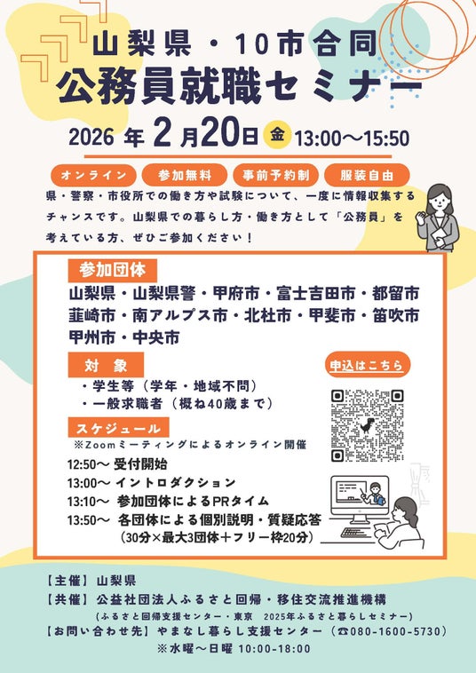 山梨県(知事:長崎 幸太郎)では、本県へのU・Iターン就職に関心がある方を対象に、山梨県・県警と県内10市合同による「山梨県・10市合同公務員セミナー」をオンラインで開催します。