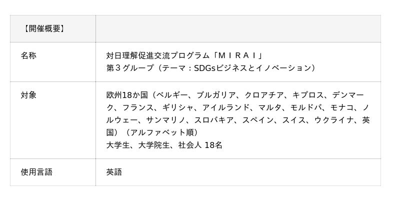 外務省が推進する国際交流事業「対日理解促進交流プログラム『MIRAI』」の一環として、本プログラムは「SDGsビジネスとイノベーション」をテーマに、欧州18か国から18名の大学生、大学院生、社会人が東京都、神奈川県、山梨県を訪問します。講義の聴講、視察、交流、文化体験を通じて、日本への理解を深めます。