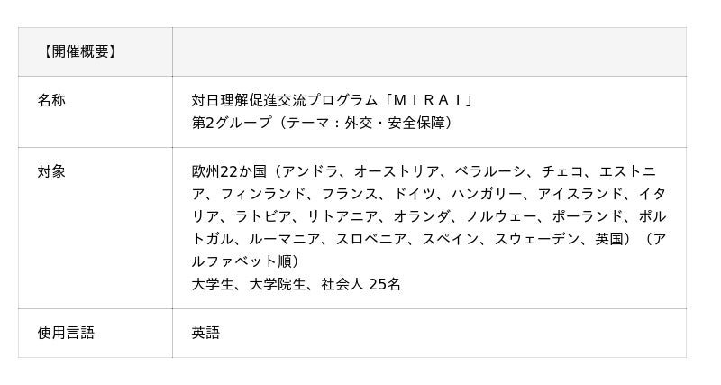 外務省が推進する国際交流事業「対日理解促進交流プログラム『MIRAI』」の一環として、欧州22か国から25名の大学生、大学院生、社会人が東京都と山梨県を訪問し、講義の聴講、視察、交流、文化体験を通じて、日本への理解を深めます。
