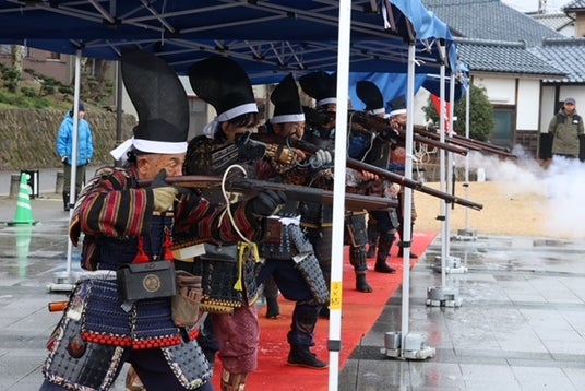 現存12天守のひとつ、福井県坂井市にある丸岡城天守のふもとで1月11日、江戸時代の丸岡藩の正月儀式に習い、火縄銃で祝砲を放つ「元朝吉祥(げんちょうきっしょう)」が行われた。甲冑姿の8人が、雨風や強風、粉雪の悪天候を物ともせずに、新春の祝いと地域の安寧を願い、火縄銃を撃ち、「ヴォーン」「バアァーン」と城下に計65発の号砲を轟かせた。坂井市の池田禎孝市長、林晃司教育長も見守る中、約50人の坂井市民らも迫力ある祝砲に歴史の重みを感じていた。