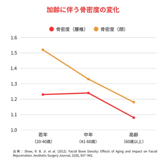 別の研究(Shaw et al., 2012, Aesthetic Surgery Journal)では、顔の骨密度は20~40代で既に低下を始めており、60代以降で顕著に低下を始める腰椎よりも早く衰えることも報告されています。