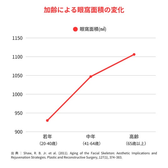 米国形成外科学会誌『Plastic and Reconstructive Surgery』に掲載された研究(Shaw et al., 2011)によると、加齢により眼窩(目のくぼみ)の面積が広がることが確認されています。