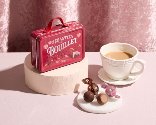 旅のときめきを閉じ込めた、バレンタイン限定のトリュフアソート。旅行カバンをモチーフにした華やかなデザイン缶の中には、香り高いビタートリュフと、まろやかなミルクティートリュフの2種を詰め合わせました。手のひらサイズの可愛らしさと上質なショコラの味わいが調和した、贈る人ももらう人も心弾むギフトです。