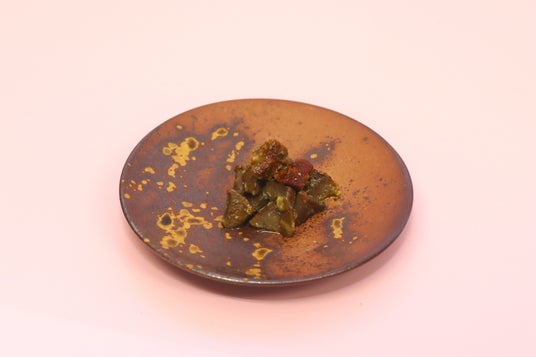 チップサイズの鶏皮をスチームオーブンで焼き上げ、トリュフオイルとピンクペッパーを振って味付け。余計な油を落として加熱することで、ヘルシーに仕上げています。