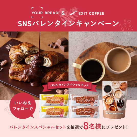 さらに、バレンタインスペシャルセットの発売に合わせ、YOUR BREAD、EXIT COFFEEそれぞれのSNSアカウントと連動したSNSキャンペーンを実施。バレンタインスペシャルセットが抽選で各2名ずつ、合計8名様に当たります。