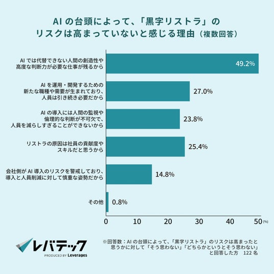 一方で、「そう思わない」「どちらかというとそう思わない」と回答した人は約2割(計20.3%)にとどまり、その理由として「AIでは代替できない、人間の創造性や高度な判断力が必要な仕事が残るから(49.2%)」「AIを運用・開発する新たな職種や需要が生まれており、人材は引き続き必要だから(27.0%)」などが挙がりました。AIによる業務代替への不安が広がる一方で、新たな雇用機会の創出に期待する声も一定数存在していることがうかがえます。