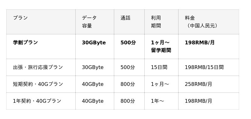 ・学割プランは、データ容量30G、中国国内通話500分の料金を含みます。