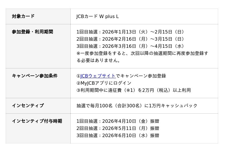 株式会社ジェーシービー (本社:東京都港区、代表取締役会長 兼 執行役員社長:二重 孝好、以下:JCB)は、2026年1月13日(火)から4月15日(水)の間、推し活やファン活に励む方々を応援する「JCBカード W plus L限定 推し活応援キャンペーン」を実施します。