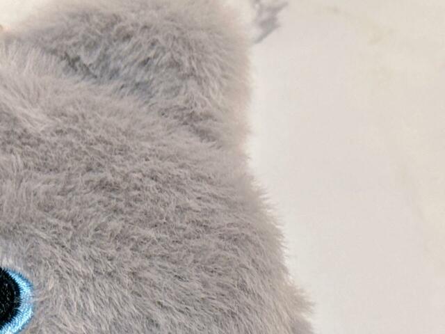 にゃんこのお顔は刺繍で描かれており、ブルーのおめめがグレーのエコファー生地と相性抜群です。
