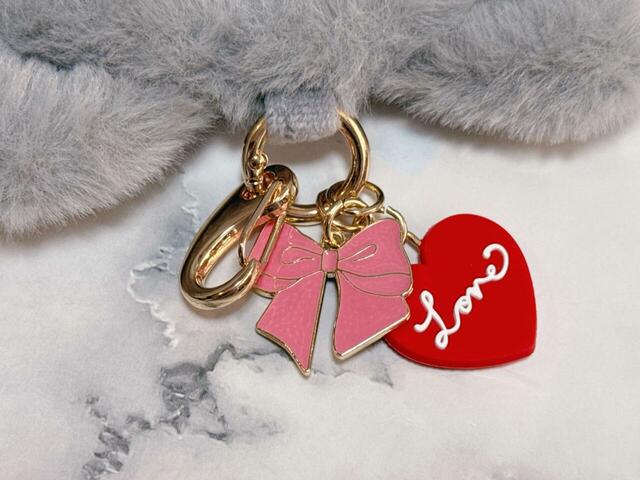 シリコン素材のレッドのハートとメタル素材のピンクのリボンのチャーム付きで、ディテールまでかわいさてんこ盛り♪グレーのエコファー生地によく映えます♪