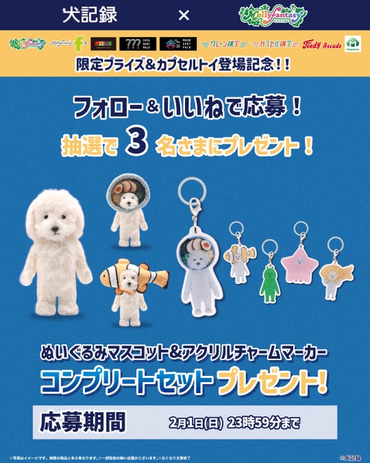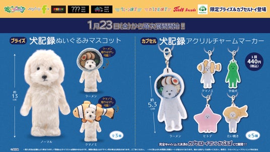 株式会社イオンファンタジー(本社:千葉県千葉市、代表取締役社長:藤原徳也、以下、当社)は、ネットに突如現れて不思議な存在感とかわいさで人気の『犬記録』プライズゲーム用景品「犬 記録 ぬいぐるみマスコット」、カプセルトイ用商品「犬記録 アクリルチャームマーカー」を、「モーリーファンタジー」「PALO」をはじめとするアミューズメント施設、オンラインクレーンゲーム「モーリーオンライン」にて1月23日(金)より順次展開いたします。