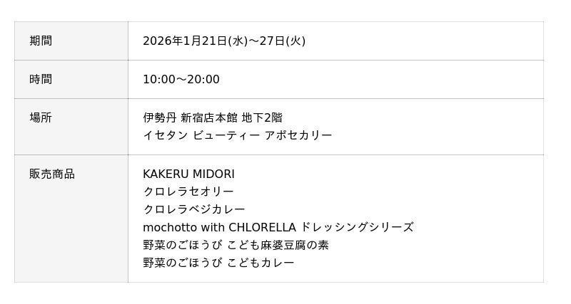 イベント期間中は、1月28日発売のこども向けレトルト食品(麻婆豆腐の素・カレー)の試食やクロレラウォーターの試飲、三越・伊勢丹アプリクーポン画面をご提示の先着200名限定のサンプル配布も実施いたします。