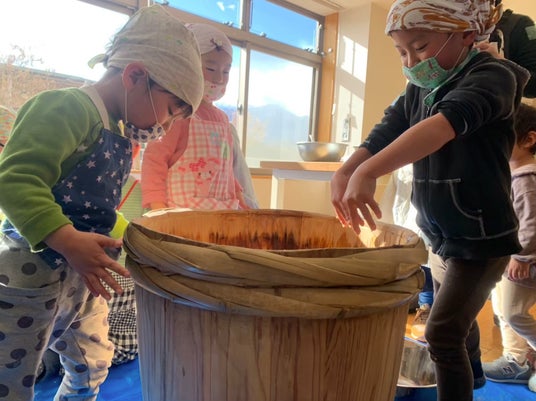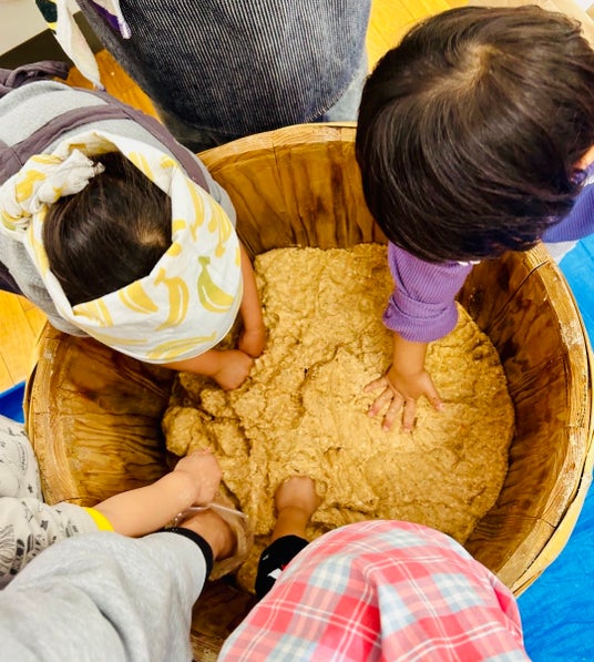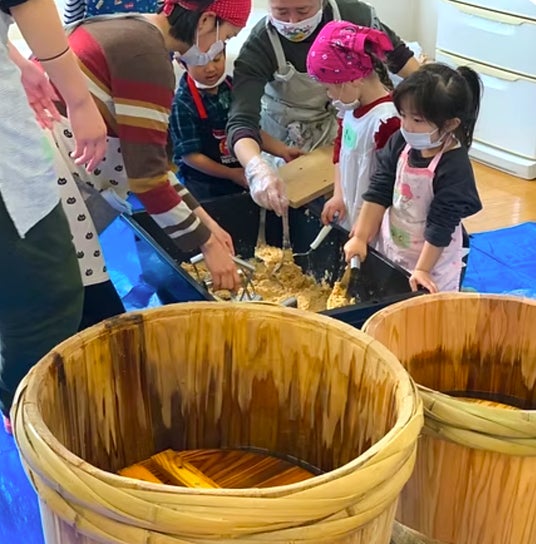 子どもと一緒に楽しめる!~八ヶ岳の大豆×南アルプスの米麹を“木樽”で仕込む、食育と交流体験~ 北杜産おにぎり&お味噌汁のミニランチ付き