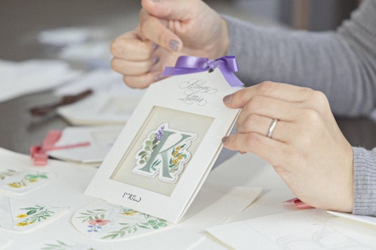 島野氏が手書きしたイニシャルと草花を組み合わせたデザインへ、実際の刺繍を施した立体的な仕上がりが特徴。指先で感じる刺繍の手触りと、アナログならではの不完全さが、唯一無二の個性を生み出します。