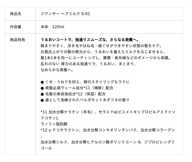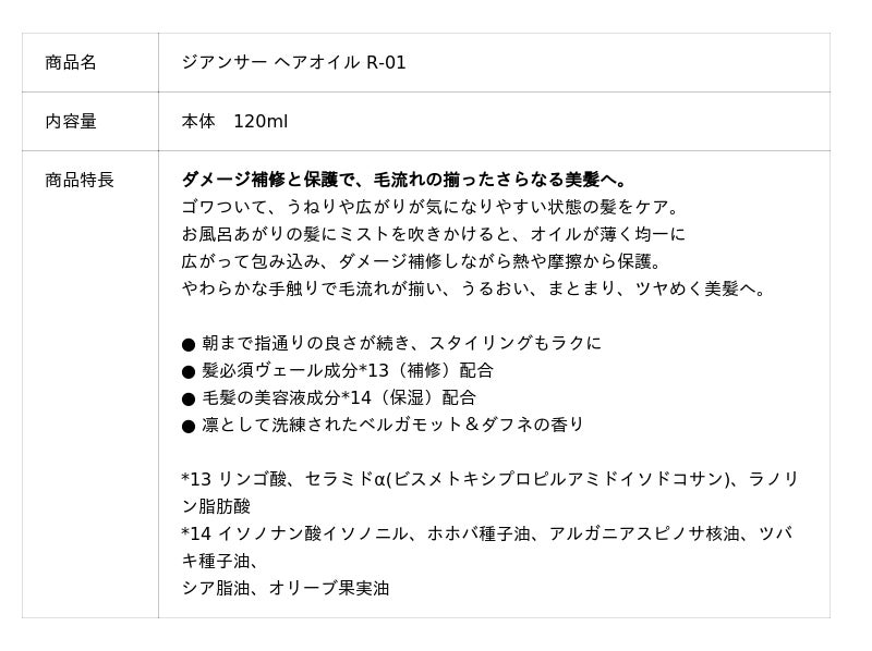 毛髪用アウトバストリートメントは、髪の質感別に2種類を開発。「ソフト」向けには、うるおいコートで、指通りスムーズな、さらなる美髪へと導く「S‐01」、「ラフ」向けには、ダメージ補修と保護で、毛流れの揃ったさらなる美髪へと導く「R‐01」の2タイプです。