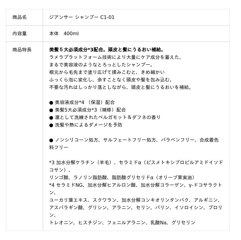 商品ラインアップは、シャンプー、トリートメント、頭皮用ケアエッセンス、毛髪用アウトバストリートメントの4カテゴリーで、それぞれ2種類ずつ、計8品です。 「THE ANSWER PROGRAM」だけに開発された独自処方です。シャンプーは「肌遺伝子モード*1」のタイプに向けて「C1‐01」「C2‐01」の2種を開発しました。2種ともに美髪5大必須成分*3配合。ラメラプラットフォーム技術により大量にケア成分を蓄えた、まるで美容液のようなとろみのあるテクスチャーです。「C1‐01」は髪に揉みこむように洗うときめ細かいふっくら泡に変化し、汚れはしっかり落としながら、頭皮と髪に潤いを補給。「C2‐01」は弾力のあるもっちり泡に変化し、汚れはしっかり落としながら頭皮から水分が蒸散するのを防ぎうるおいを保護します。