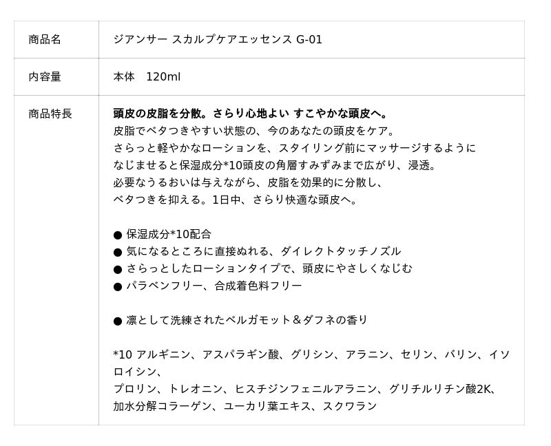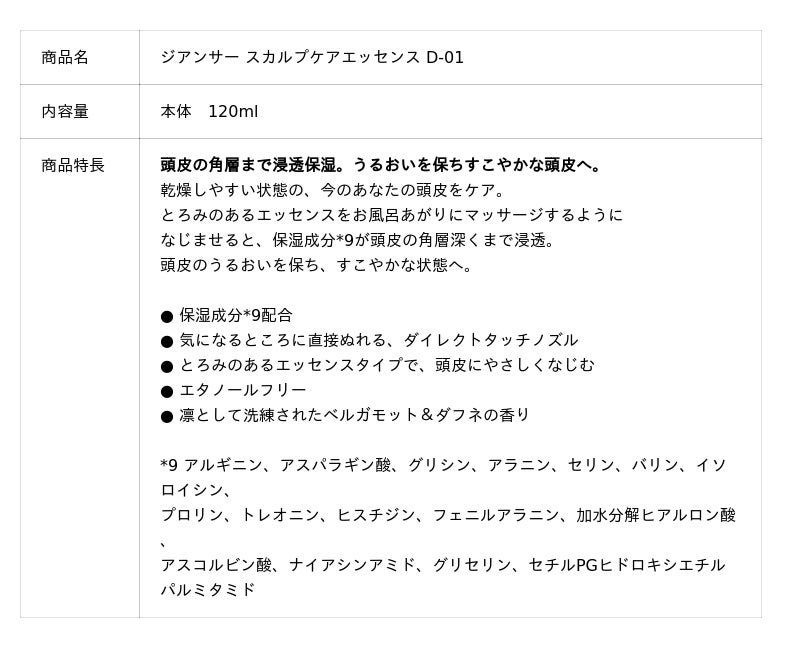 頭皮用ケアエッセンスは頭皮の肌質から、頭皮が乾燥しやすい「ドライ」、頭皮が皮脂でベタつきやすい「グリーシー」の2タイプに合わせて開発。「ドライ」向けには、頭皮の角層まで浸透保湿により、うるおいを保ち、すこやかな頭皮へと導く「D‐01」、「グリーシー」向けには、頭皮の皮脂を分散し、さらりと心地よい、すこやかな頭皮へと導く「G‐01」をそろえました。