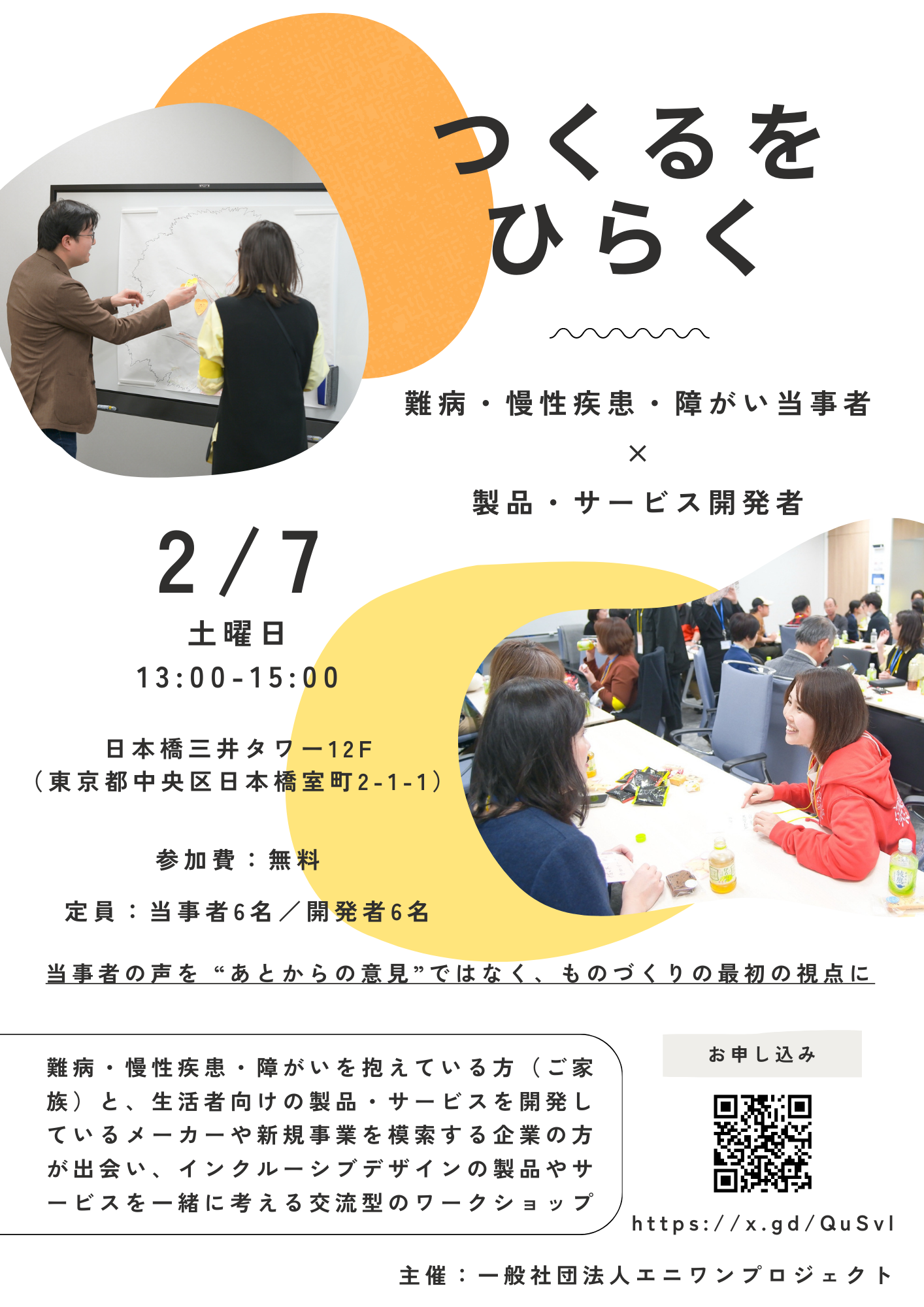 「病気のある人もない人も当たり前に生きられる世の中に」をスローガンに掲げ、難病当事者3名が活動する、一般社団法人エニワンプロジェクト(本社:東京都練馬区、代表理事:狐崎友希)が、2026年2月7日(土)13:00-15:00、日本橋にて第1回【つくるをひらく】を開催します。