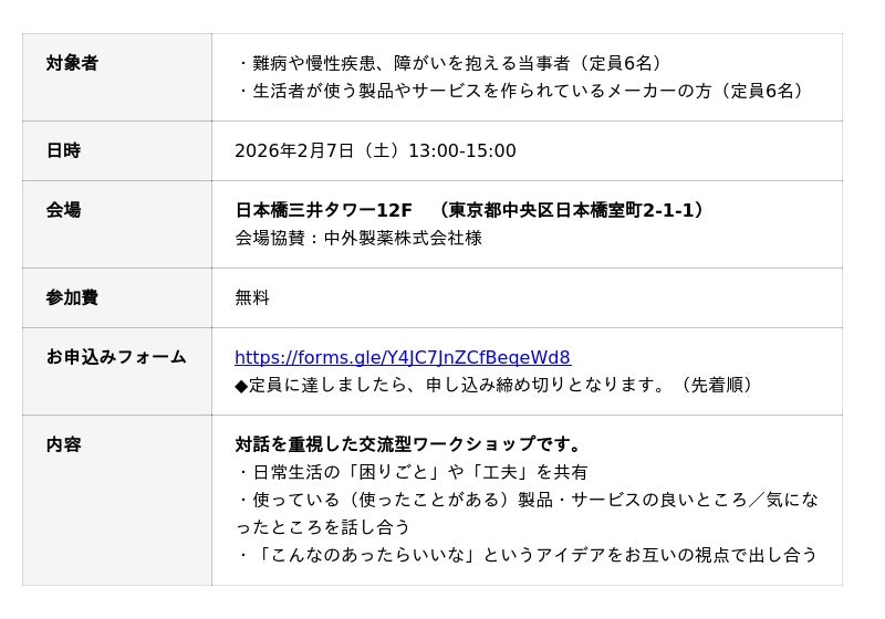 本イベントは、難病や慢性疾患、障がいを抱えている方(ご家族)と、生活者向けの製品・サービスを開発しているメーカーや新規事業を模索する企業の方が出会い、インクルーシブデザインの製品やサービスを一緒に考える交流型ワークショップです。