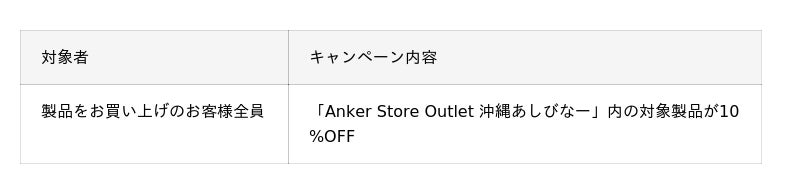 この度オープンを記念し、2026年1月22日(木)~ 2026年2月1日(日)の11日間限定で「Anker Store Outlet 沖縄あしびなー」内の対象製品を10%OFFでご購入いただけるキャンペーンを実施します。