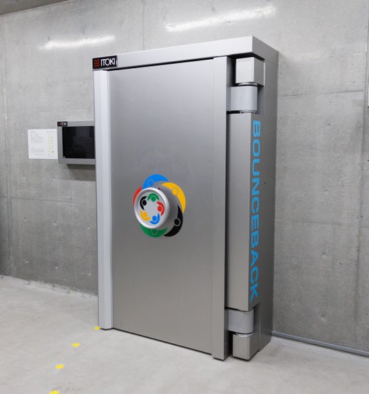 当社は創業以来の金庫技術を発展させ1966年から特殊扉を手掛け、国内の高度医療・研究施設等におよそ3,000基もの特殊扉を納入しています。その技術を応用し、耐衝撃、気密水密、放射線遮蔽といった防災・防衛機能を備え、有事や災害時に人命と社会基盤を守るための役割を担うマルチ防災シェルター扉「BOUNCEBACK」を2024年に開発しました。