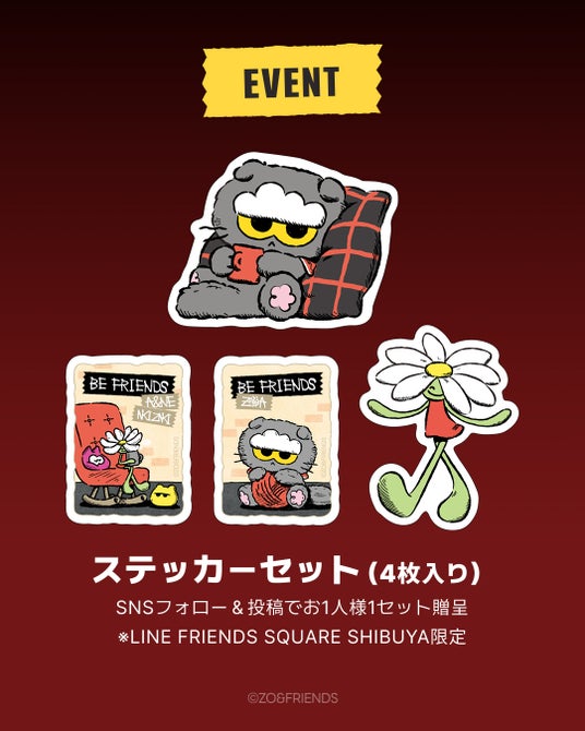 ZO&FRIENDS 公式Instagram・LINE FRIENDS SQUARE Japan 公式InstagramをWフォローし、渋谷ストアPOP-UP会場の写真や動画をSNSに投稿したら、その場でZO&FRIENDSオリジナルステッカー(4枚入り・非売品)1セットをプレゼント。