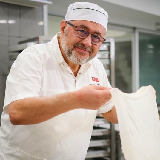 職人技手作業によって何十層にも重ねられたバクラヴァのパイ生地は、経験を積んだ職人によって成しえる技術の結晶です。またバクラヴァは工程ごと(生地作り、生地の重ね合わせ、焼成、シロップ作りなど)に熟練職人がおり、分業しているため、一人でバクラヴァを作り上げることはなく、何人もの職人の手で一つ一つのバクラヴァができています。