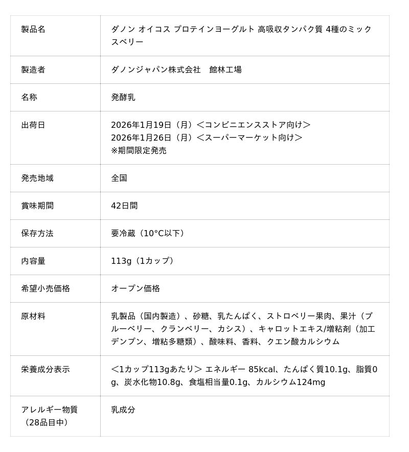 ダノンジャパン株式会社(本社:東京都目黒区、代表取締役社長:ロドリゴ・リマ、以下ダノンジャパン)は、カラダを動かすすべての人の良質なタンパク質補給を応援する「オイコス」ブランドより、季節限定フレーバーとして「オイコス プロテインヨーグルト 高吸収タンパク質 4種のミックスベリー」を新たに発売します。2026年1月19日(月)より全国のコンビニエンスストア向けに、1月26日(月)より全国のスーパーマーケット向けに出荷を開始します。