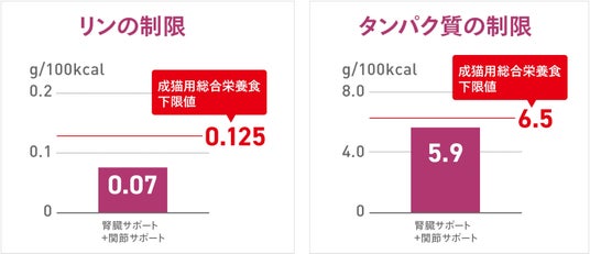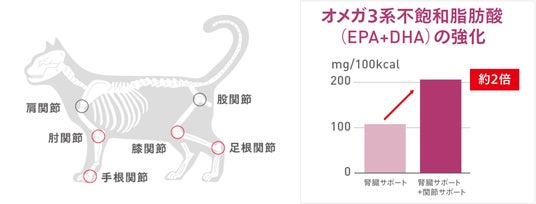 今回新たに発売する「猫用 腎臓サポート+関節サポート」は、猫の慢性腎臓病の栄養管理に適切な食事療法食として適切な栄養バランスに設計するとともに、これまで注目度が低かった関節疾患の食事療法食としても対応するために、オメガ3系不飽和脂肪酸(EPA+DHA)を豊富に配合しており、継続して給与することで関節炎などの猫にとって充分な量の栄養を摂取できるよう設計されています。