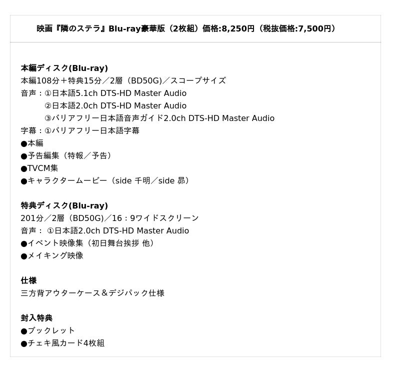 特典ディスクの収録分数が当初予定の90分から200分に大幅に増えました!!劇場公開までに実施された5つのイベント映像をすべて収録!福本さんと八木さんがシークレット鑑賞して会場を騒然とさせた公開御礼舞台挨拶もしっかり収録されています。イベントに来られなかった方も十分にお楽しみいただけます。また、劇場公開を記念して全国で放映された、福本さんと八木さんが映画『隣のステラ』スタッフのエピソードを交え制作秘話を語り尽くす特別トーク番組「隣のステラに願いを込めて」を全6エピソードすべて収録!見逃してしまった方も、もう一度見たい方も必見です!本編と合わせて映画『隣のステラ』を余すところなくお楽しみいただけます!商品情報 ※商品仕様、デザインは予告なく変更する場合がございます