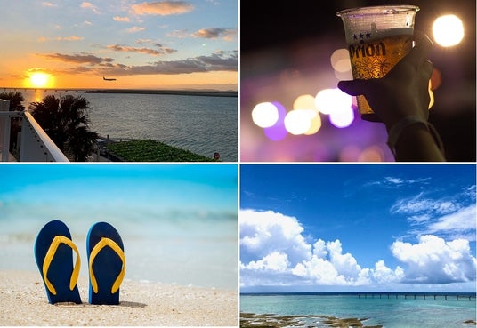 遠浅に広がる瀬長西ビーチ、水平線へと沈む夕日、夜空にきらめく星々。