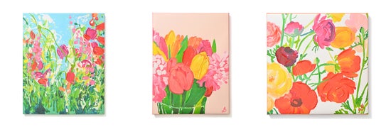 カナダ・モントリオールで育った抽象画家「クレア」のアート作品です。グラフィックデザイナーとしての経験を経て生み出された作品は、世界中の個人・企業コレクションに収蔵されています。色彩鮮やかなフラワーモチーフで、春の華やかなコーディネートに相応しい1枚です。