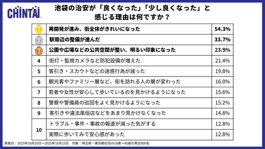 池袋の治安が「よくなったと感じる」「少し良くなったと感じる」と回答した人の理由としては、「再開発が進み、街全体がきれいになった」(54.3%)が最多でした。次いで「駅周辺の整備が進んだ」(33.7%)、「公園や広場などの公共空間が整い、明るい印象になった」(23.9%)と続き、街の景観や回遊性の向上が、治安の改善実感につながっていることがうかがえます。