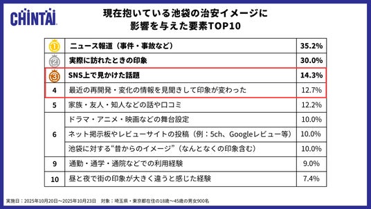 現在の池袋の治安イメージに影響した要因を見ると、令和でも1位は「ニュース報道(事件・事故など)」(35.2%)、2位は「実際に訪れたときの印象」(30.0%)となり、上位2つの構図自体は平成から大きく変わっていません。一方で、3位に「SNSで見かけた話題」(14.3%)が入り、「家族・友人の口コミ」(12.2%)を上回りました。口コミよりSNSの順位が上がっている点は時代の変化を象徴しており、情報の“リアルタイム性”が治安イメージの形成により大きく影響していることがうかがえます。