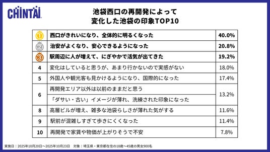 お部屋探しのリーディングカンパニー株式会社CHINTAI(本社:東京都港区 代表取締役社長 奥田倫也)は、東京都と埼玉県に在住の男女900名を対象に、「池袋の治安イメージと再開発による意識変化」に関する調査を実施しました。