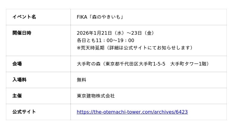 東京建物株式会社は、焼き芋をはじめとした個性豊かな「芋」を使ったスイーツ店が集結するFIKA「森のやきいも」を2026年1月21日(水)~23日(金)(各日とも11時~19時・荒天時延期)の3日間にわたり、地下鉄大手町駅に直結する「大手町の森」(東京都千代田区、大手町タワー1階)で開催しますのでお知らせします。