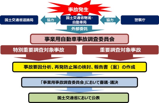 - 国土交通省は平成26年(2014年)6月、(公財)交通事故総合分析センターを事務局として、各分野の専門家から構成される「事業用自動車事故調査委員会」を設置し、事業用自動車の重大事故について事故要因の調査分析を行っている。